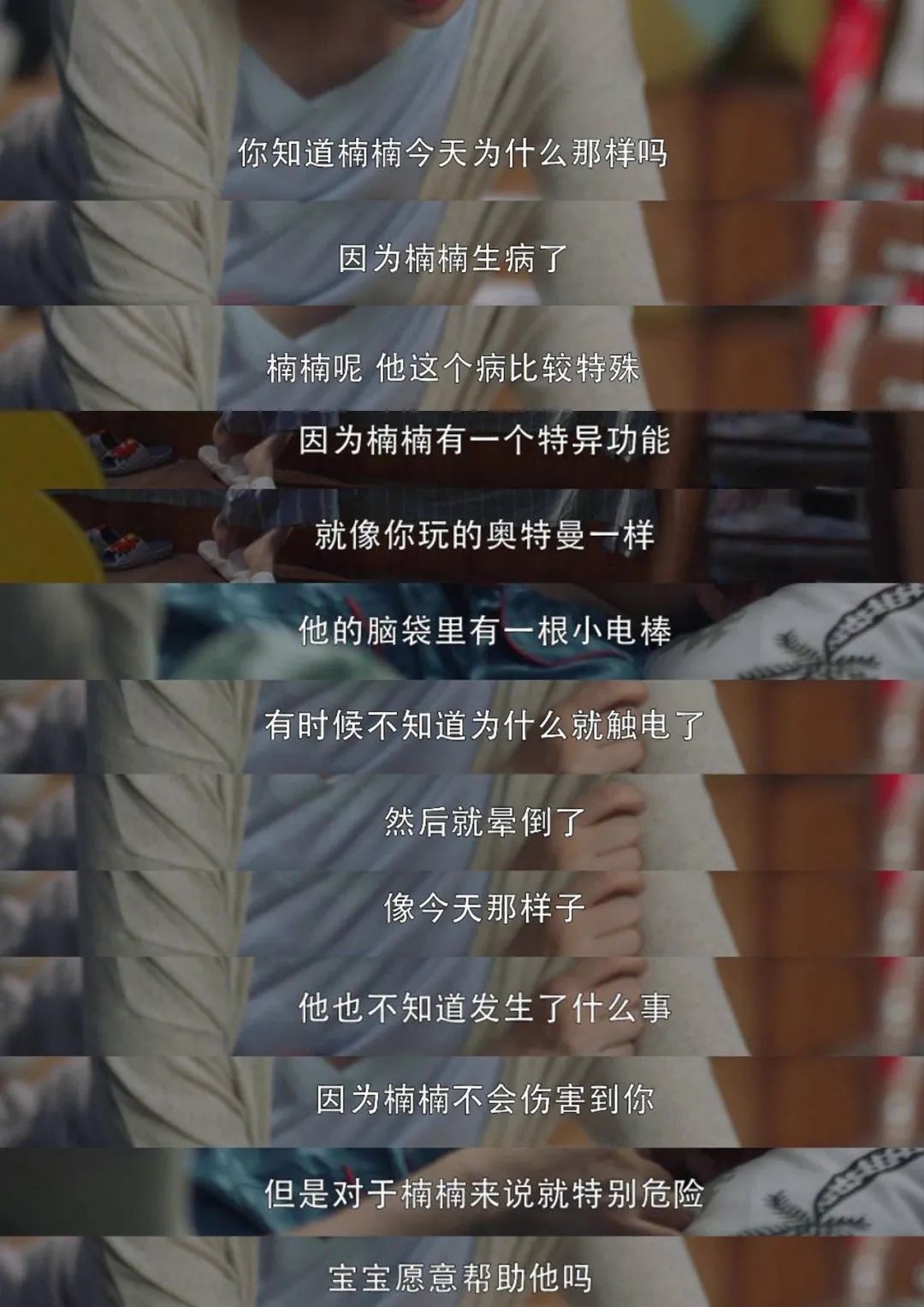 顾佳拒绝迎合其他家长逼迫楠楠退学,园长经过考量,同意让楠楠继续上学。不但如此,她还用自己的方法帮助儿子树立了正确的认知和价值观,教会了孩子包容与接纳。她告诉孩子,癫痫患儿楠楠只是脑袋里有一个小电棒,触电就晕倒了。通俗易懂又科学,癫痫就是脑细胞过度放电导致的。
